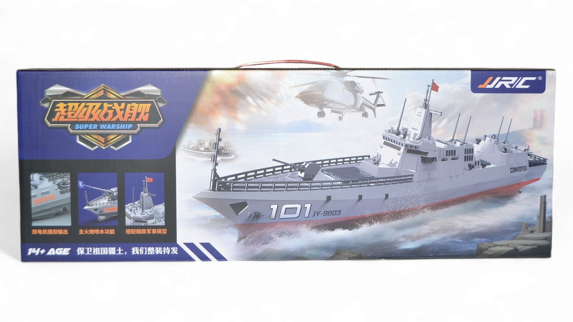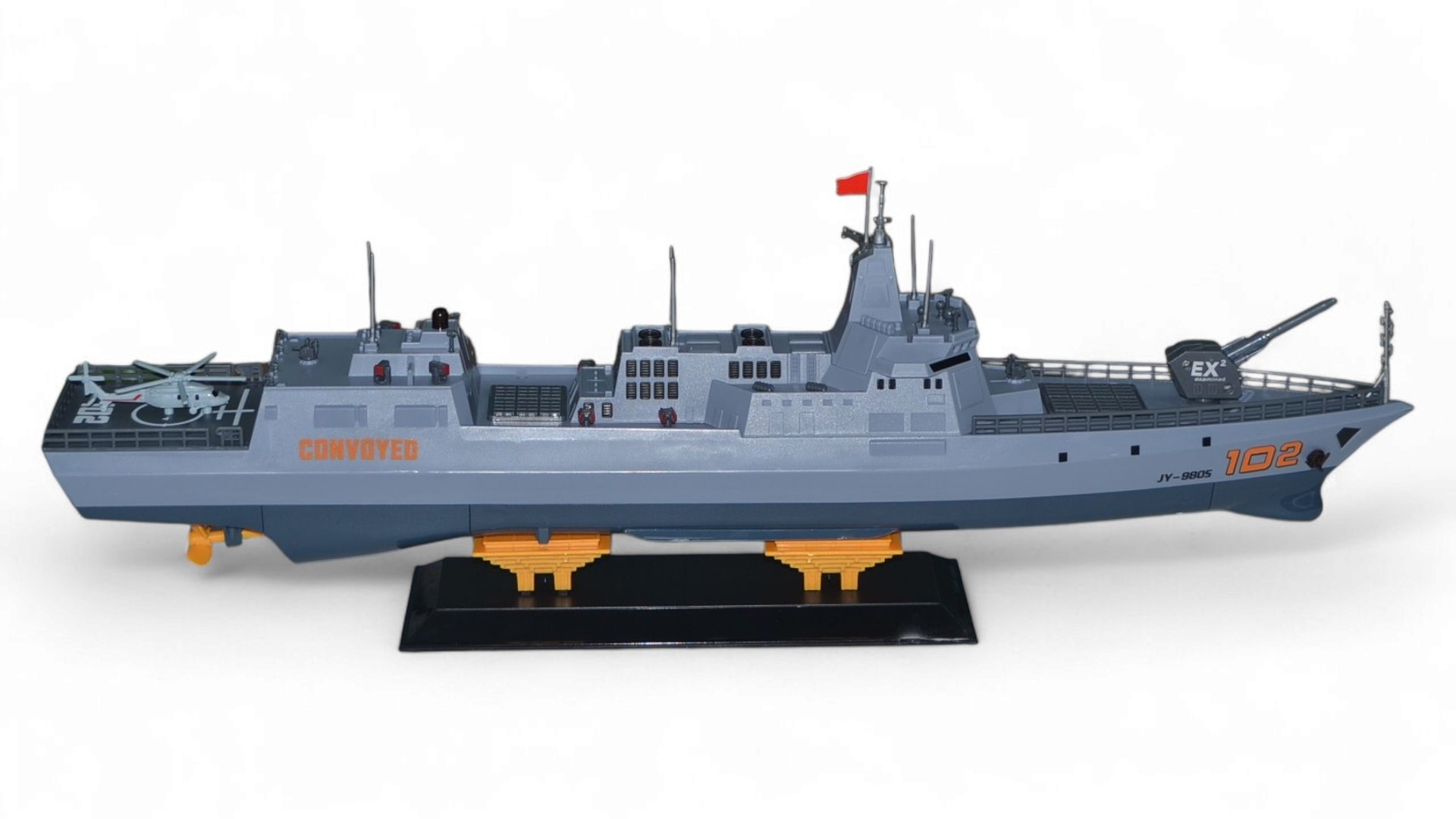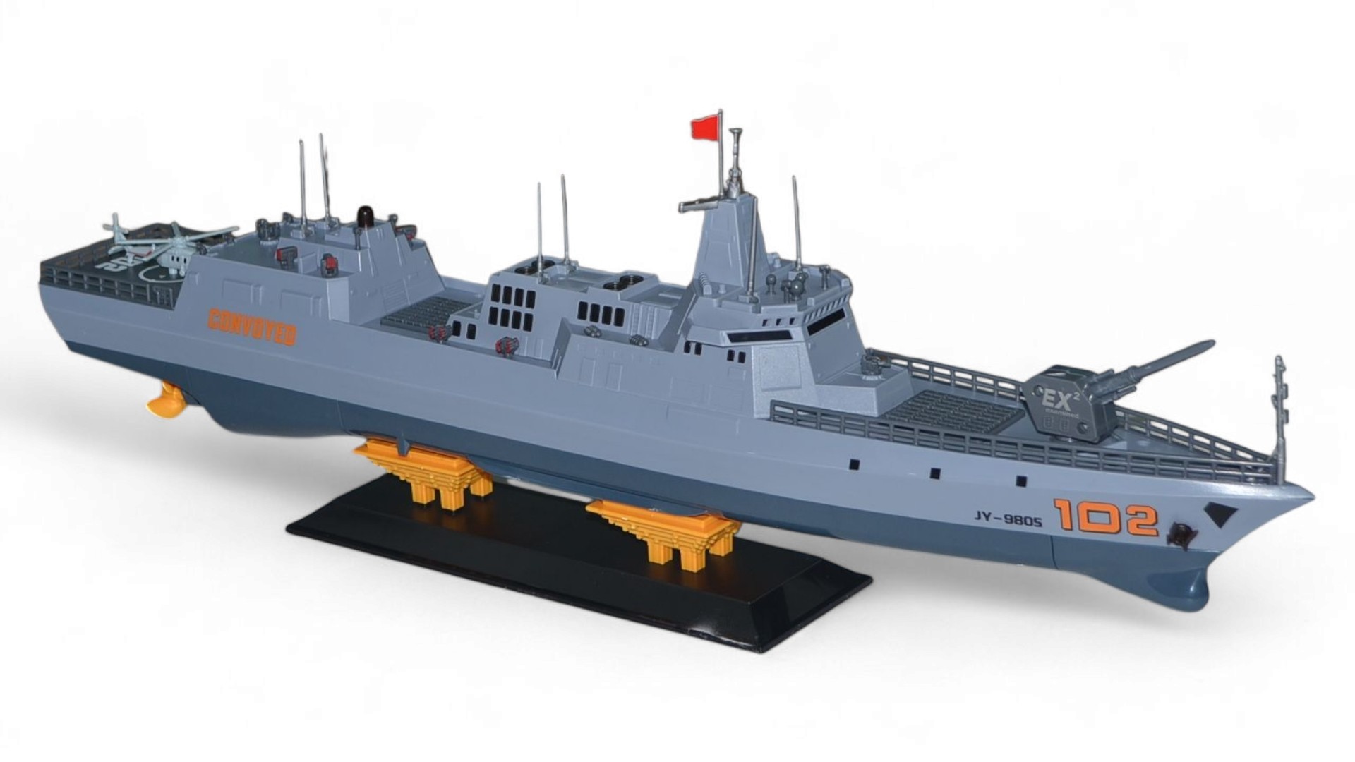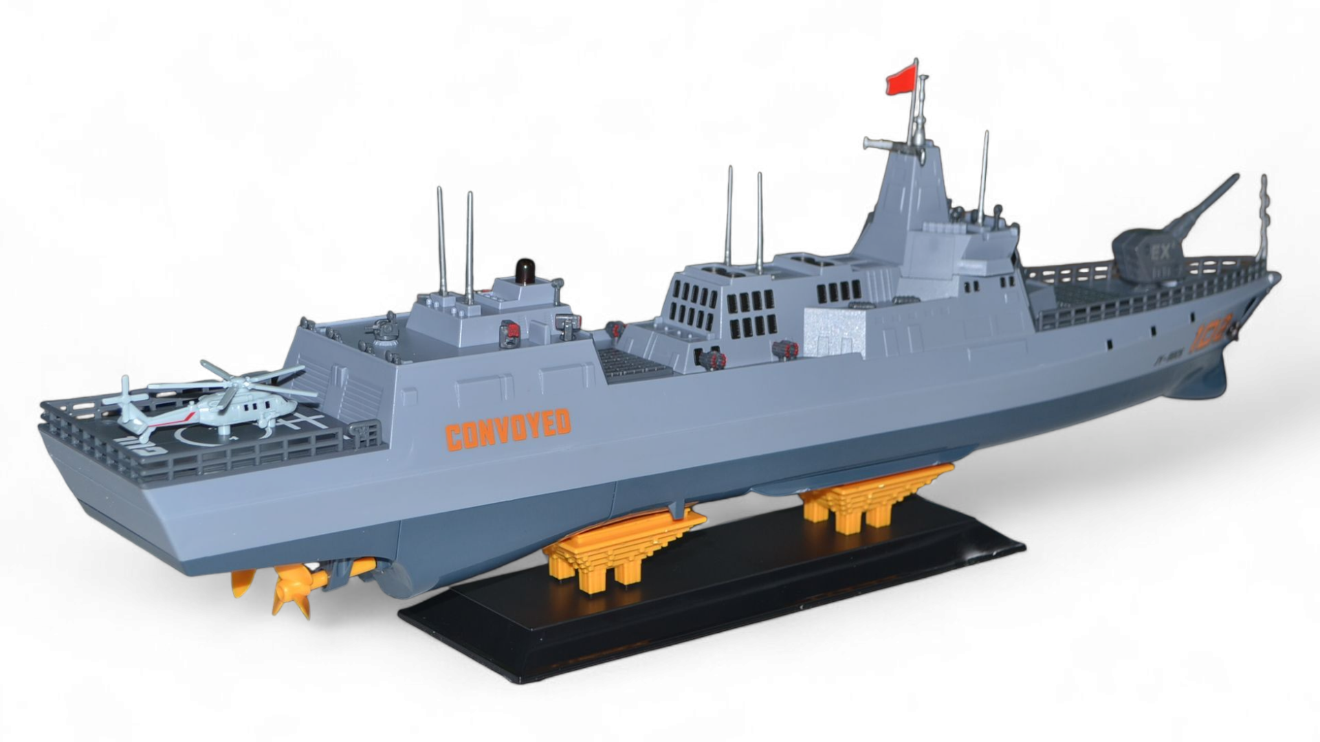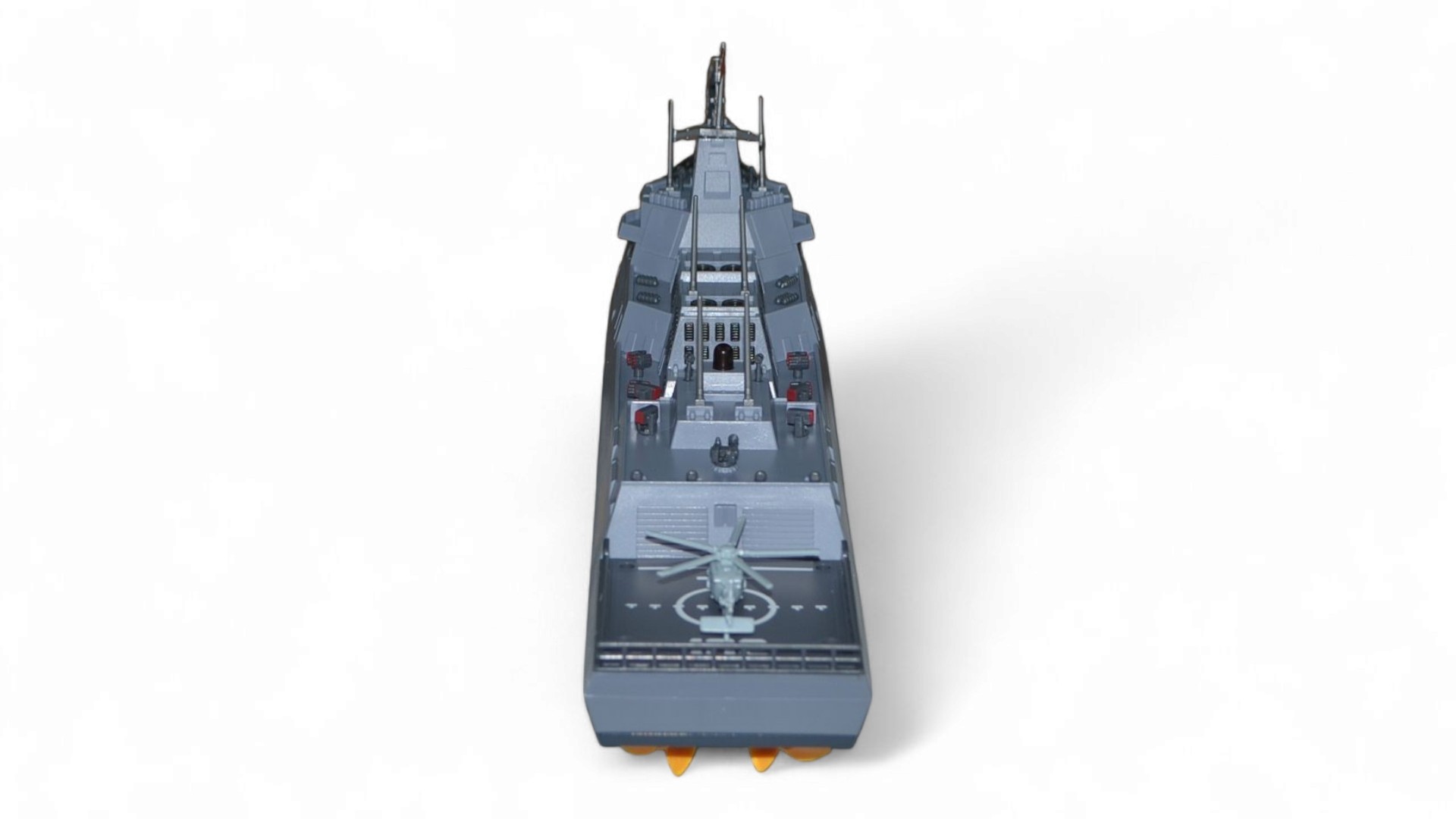 Корабль представляет собой коллекционную версию в масштабе 1:375. Модель управляется с помощью полнофункционального пульта дистанционного управления, радиус действия которого составляет до 100 метров. Корабль оснащен двумя мощными электродвигателями, которые контролируют работу двух винтов. Основными особенностями являются: четкая детализация всего корпуса, высокая скорость и маневренность. На борту корабля расположились вертолет и пушка. Такая модель обязательно понравиться коллекционерам военной техники и просто любителям реалистичных радиоуправляемых моделей. Модель сделана из качественного пластика, поэтому она долго прослужит не только в качестве экземпляра коллекции, но и в активном использовании на воде!