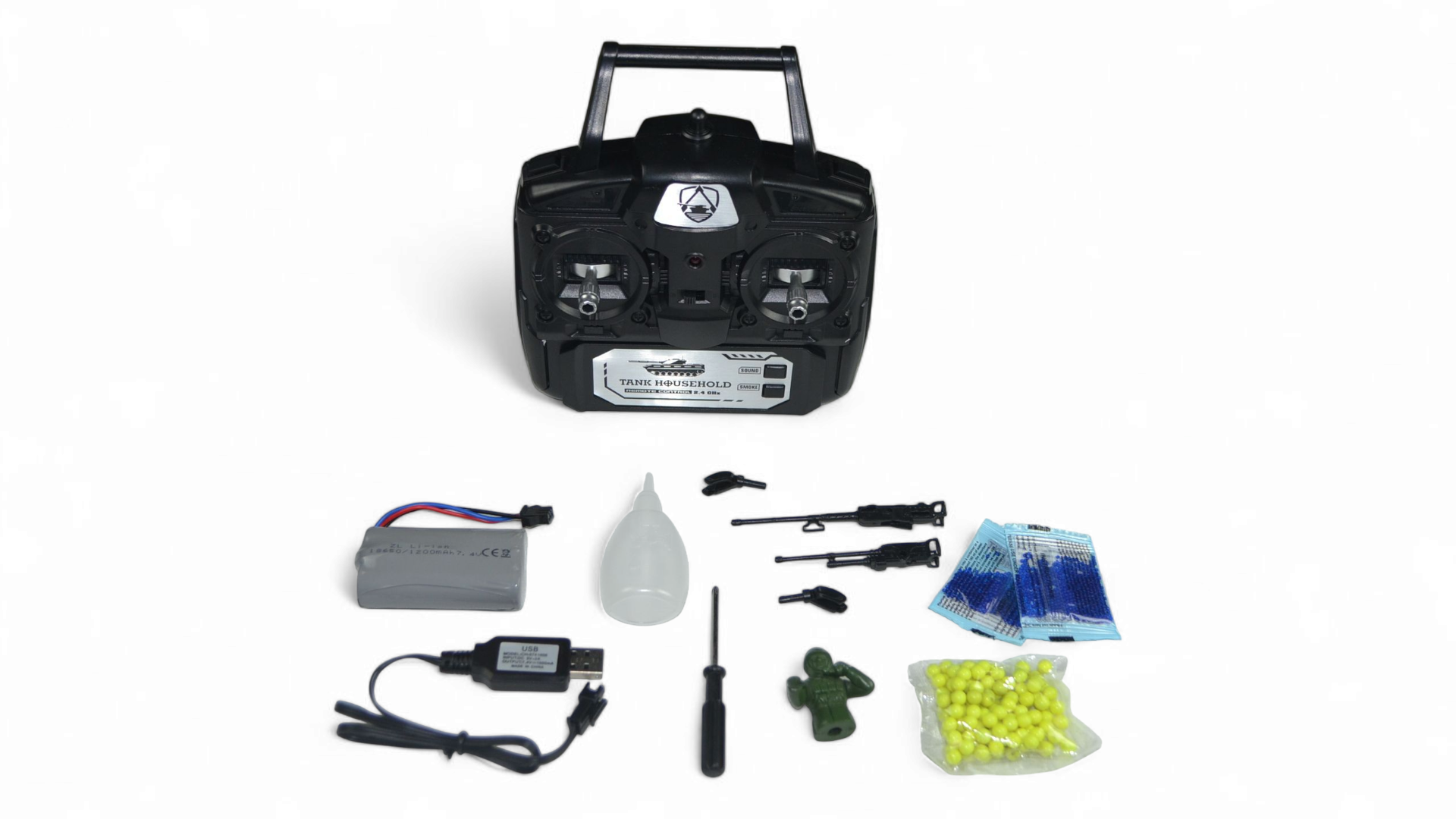 В комплекте все необходимое для запуска: танк, аккумулятор, зарядное устройство, комплект пулек, орбизы, мишень для стрельбы, инструкция.